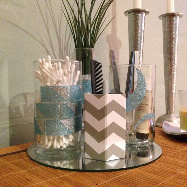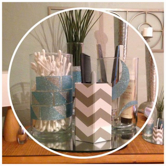 I chose the silver and aqua for my crafting project to match the colors of my bedroom.  The aqua is actually a soft blue.  I needed extra storage for my beauty items that I wanted on hand and ready to grab.  I am using my glittered glass containers to hold cotton swabs, fingernail files and my hand lotion, and one to add a touch of green plant beauty.