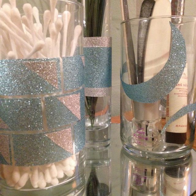 Then the fun part!  I stuck the shapes onto the glass containers, some random, some layered.  When you are working with sparkles you really just cannot go wrong!  Use your imagination and get creative with your shapes!  Get the kids involved and let them help you stick the tape on.