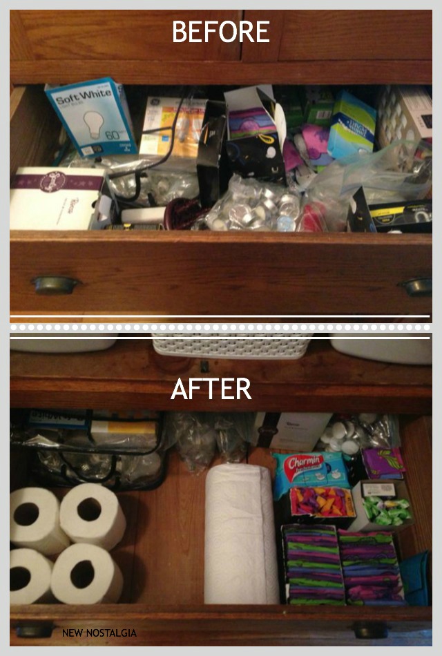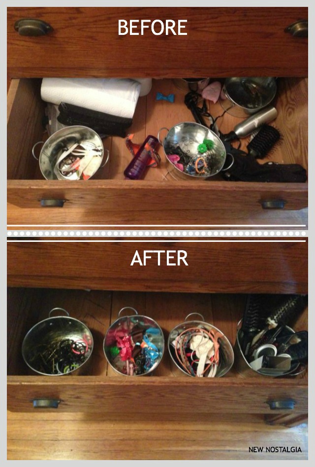 Not anymore! In less than 45 minutes, the cabinet & 3 drawers were minimalized & organized. There was not much to giveaway, but a ton to throw away! Old, empty bottles, dried up polish, broken curling irons.