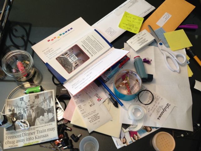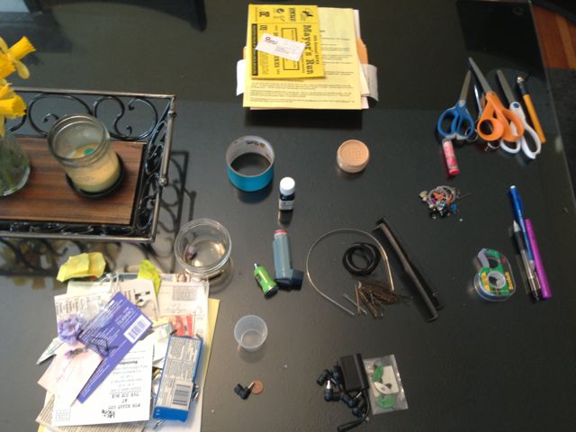 I started with making piles of things. Like with like. It helped to get whatever looked like trash out first. Then I had office supply pile, an earring pile, a pile of hair bands & combs, a pile of papers that needed attention, and some miscellaneous stuff.
