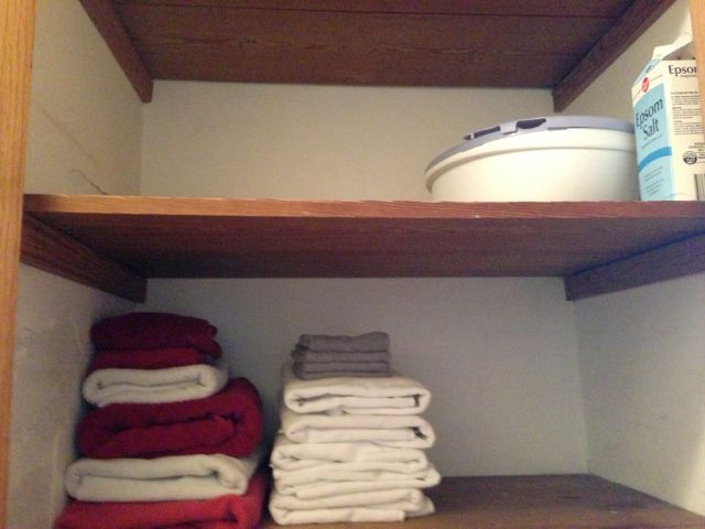 Let’s talk towels. If you read my bathroom makeover post, you will know that we have hooks in our bathroom for towels. Each family member has their own hook and a different color. The towels you see here on the right are for guests. The towels you see on the left are old towels that I use when coloring peoples hair. The grey washcloths are…well..grey wash clothes. The girls and I use them to wash our faces.