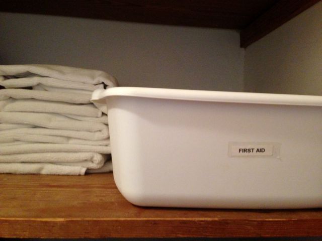 As you can see in the above picture, we keep towels (more on towels later), & first aid on the upper shelf. Underneath I have a bin for beauty products on the right, a bin for manicure supplies in the middle, & a bin of natural ingredients to make some of my natural beauty products…like Homemade Natural Lip Balm.