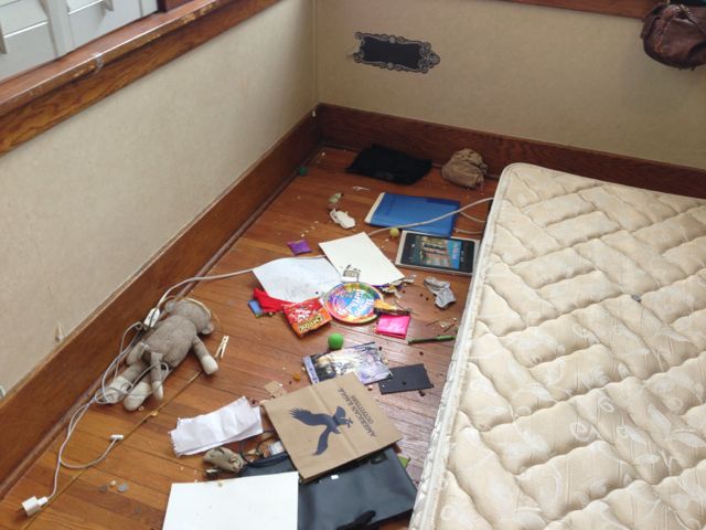 Under her bed? 90% of it was trash. Easy to clean up. I also grabbed a bed frame that was in our garage that sits quite high so sweeping under her bed is now a breeze. It is high enough to see under from the door so I will know if things start getting stuffed under there. {smile}