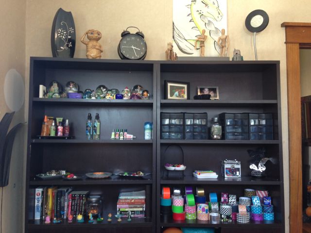 She has a business called Twisted Tape. These two shelves hold her tape and inventory. There are cabinets under these shelves that hold her mailing supplies.