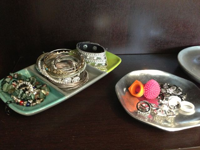 I had to get a system for her accessories. They were just scattered and made dusting impossible. I brought in little platters, one for bracelets, one for rings, one for bobby pins and hair elastics. I took a good look what made up the bulk of her clutter and made little homes for those items.