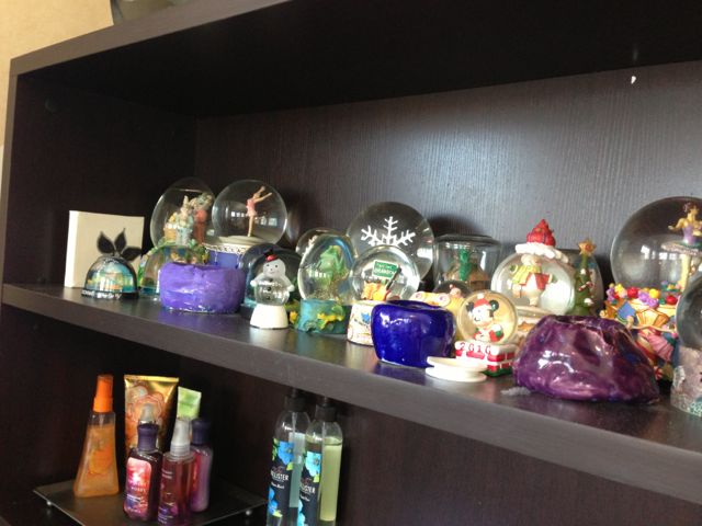 I only allow one collection displayed per girl. This is Teagan’s snow globe collection. She has been collecting since she was itty bitty. Also a couple clay pots she made in school when she was younger.