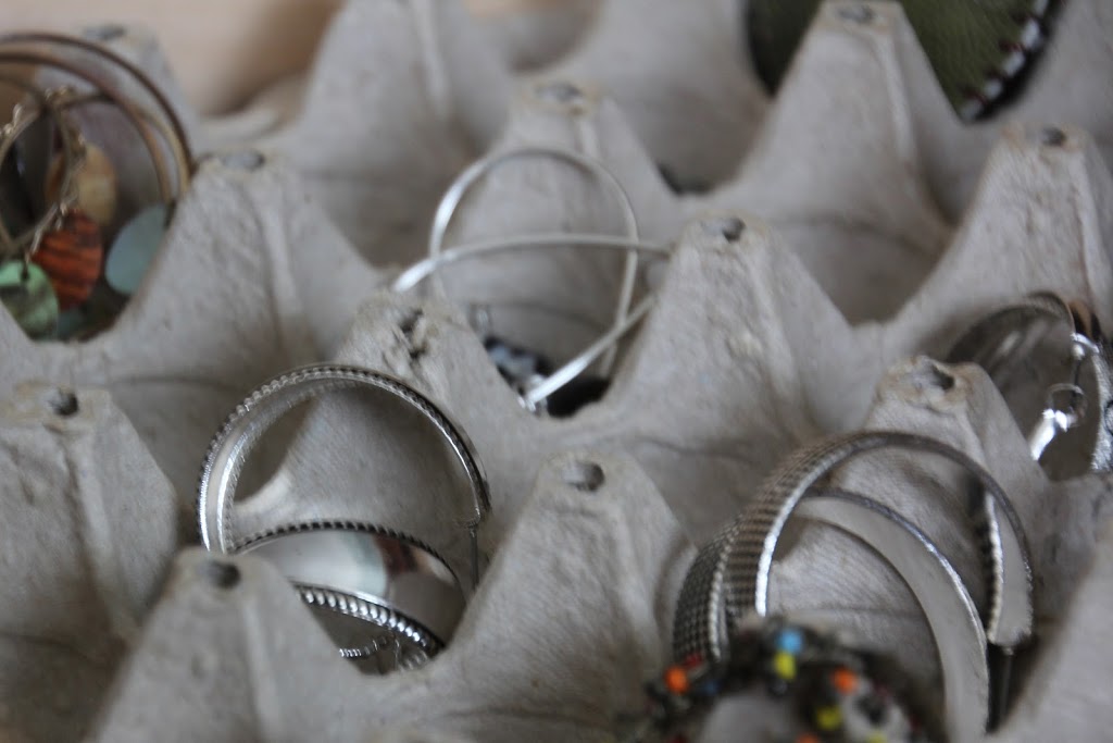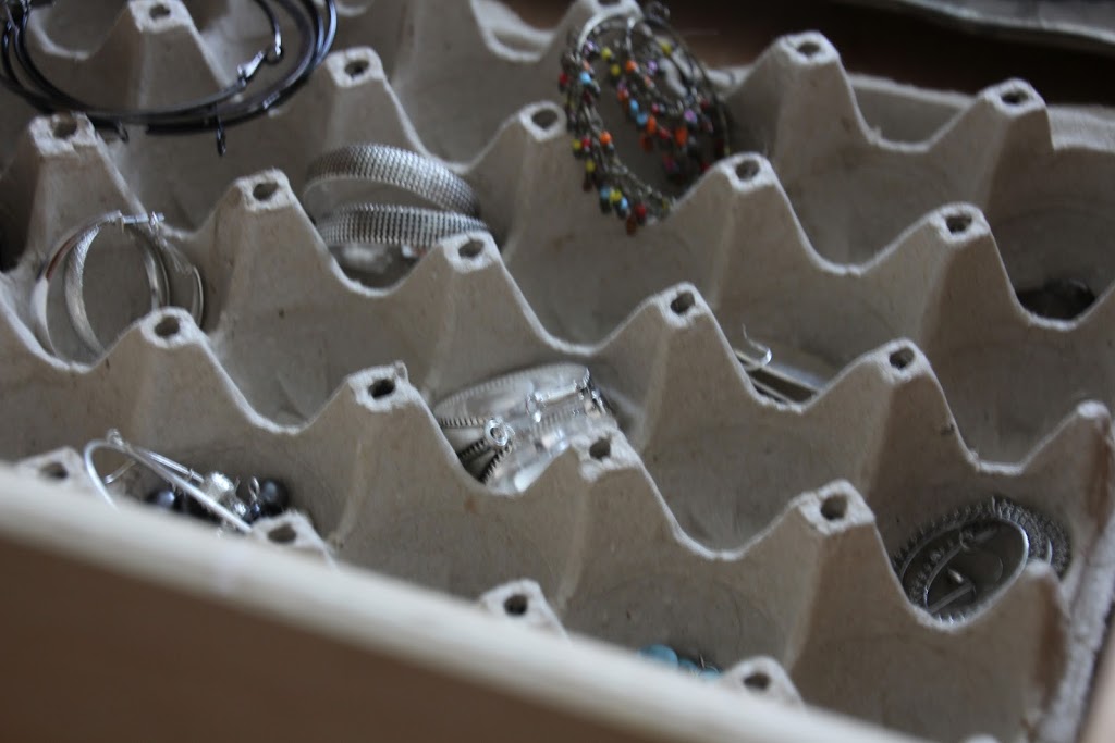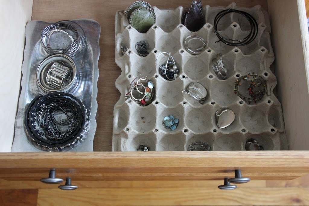 I really like keeping my jewelry in a drawer. There is something about having them tucked down deep, that keeps them easy to organize and see what I want to wear that day. I keep my bracelets on a silver platter to the left of my earrings, but if my earring collection ever grew, I could easily another egg carton. cut to size to fit, instead. These would also work great for rings.