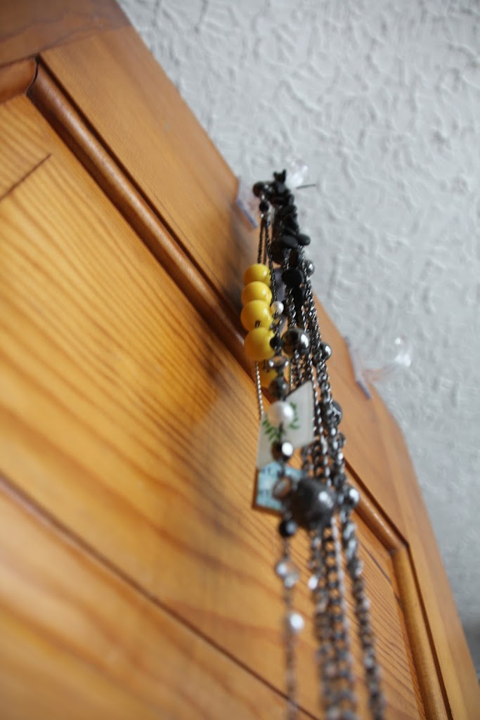 If you have wall or cabinet space, you can use screw hooks for the necklaces. The following link will take you to the blog post and pictures I have about it: