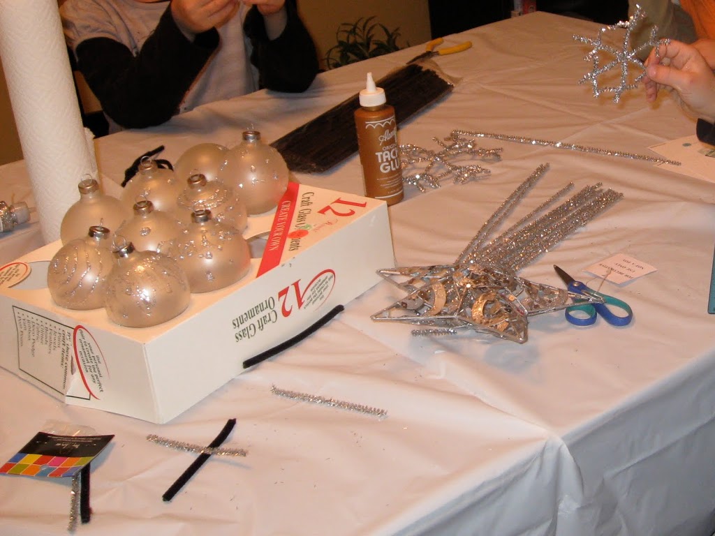 We made Marbled Christmas Balls, Silver Pipe-Cleaner Snowflakes, Circle Paper Ornaments, Glitter Glue Christmas Balls, Simple Mirror Ornaments, and Mini Black Pipe-Cleaner wreaths.