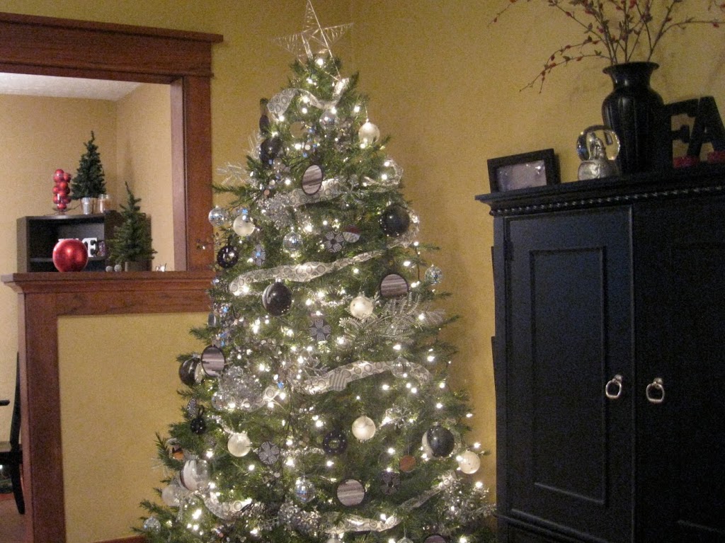 Last year we wanted to change up the tree from warm, fall type colors to shimmery, shiny, black and white, and circle- themed. I didn’t want to spend much, so we made most of our ornaments and found ribbon for half off! We have the same tree up this year, and I still love it and the memories of making the ornaments with my girls.