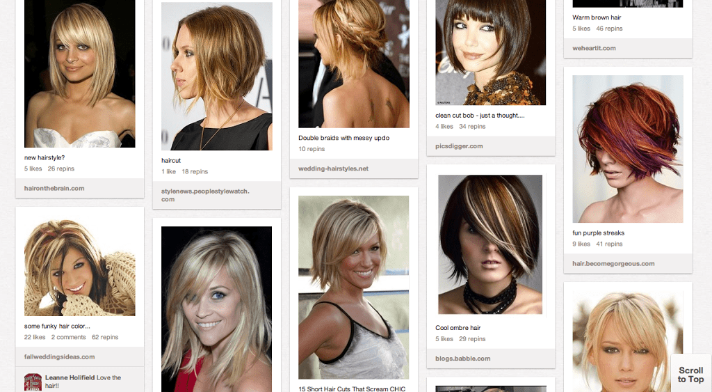 In two years, my hair has grown from balder than bald to a medium shoulder length. It is fun having hair again! I recently got my haircut by Mandy at Tangerine, and I love it. She cut the back up a bit and did a slight angle down to the front pieces. I have decided to go without bangs for awhile, which is different for me. I have a high forehead that really looks better with bangs, but sometimes a girl just has to mix it up a bit. Although I love the cut, I’m finding myself in a rut with this in-between length. I decided to search Pinterest for some inspiration and here is what I found!