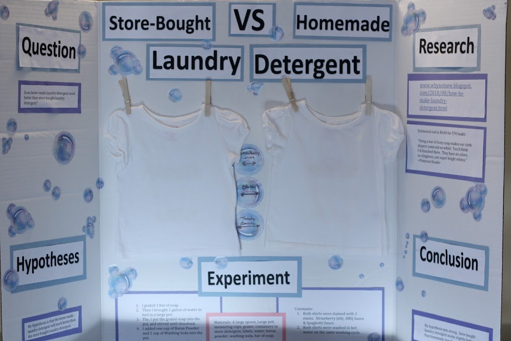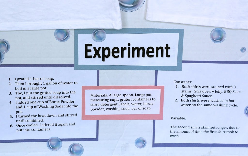 March 8, 2013 at 11:25 pmGreat science project! And she did an awesome job of presenting her experiment. I also make laundry detergent and use a similar recipe but no water – just the soap, borax, and washing soda. One thing to note is that different soaps wash better/worse. I use Fels Naphtha, which is specifically a laundry soap. It would be interesting to further compare two homemade soaps using a different bar of soap.