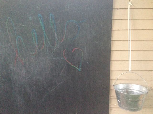 ~Using the power drill with a screwdriver bit, we screwed it into the wall making sure we hit studs (it is the side of our garage, and the studs were easy to find as they are exposed in our garage), and tied a little bucket of chalk with holes drilled into the bottom for water drainage. We are counting on the rain to be our friend and help us wash the board clean…or the hose will do just fine too! No chalk mess! We used a nail to hang the bucket and then gave each other a high-five.
