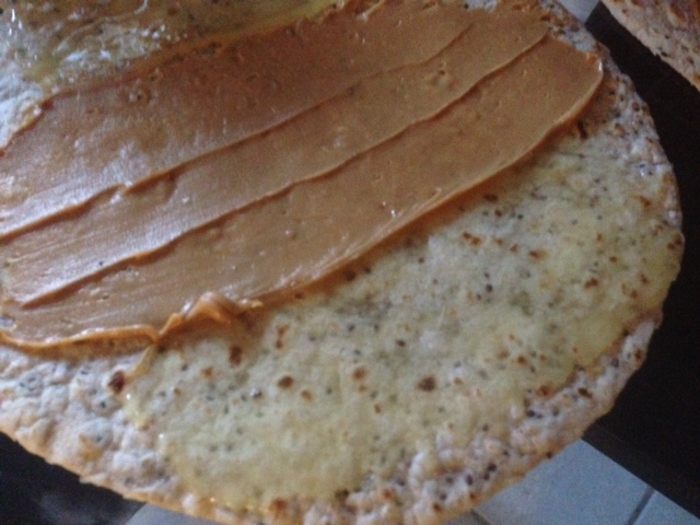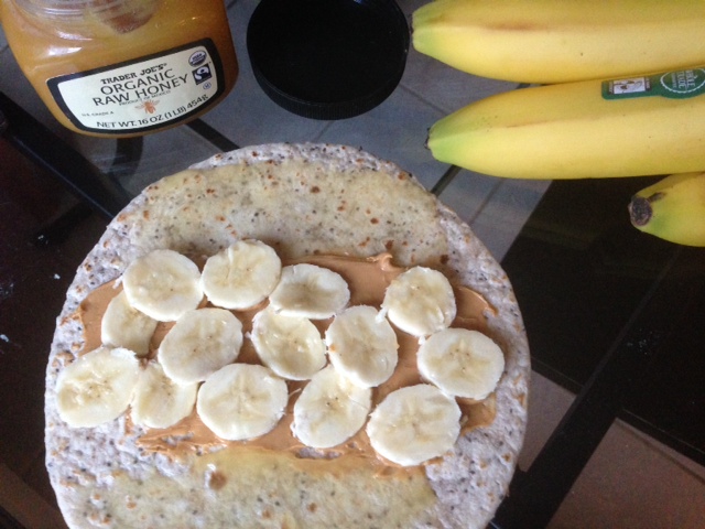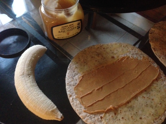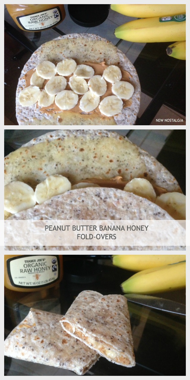 I simply spread a couple of tablespoons of peanut butter in the middle, then use raw honey on the sides which serves perfectly as the ‘glue’ to hold these fold-overs together. I slice 1/2 a banana, arrange the slices in the middle to fit on top of the peanut butter, the fold the two honeyed sides into the middle. The banana stays nice and secure in the middle, and does not turn all icky and brown.