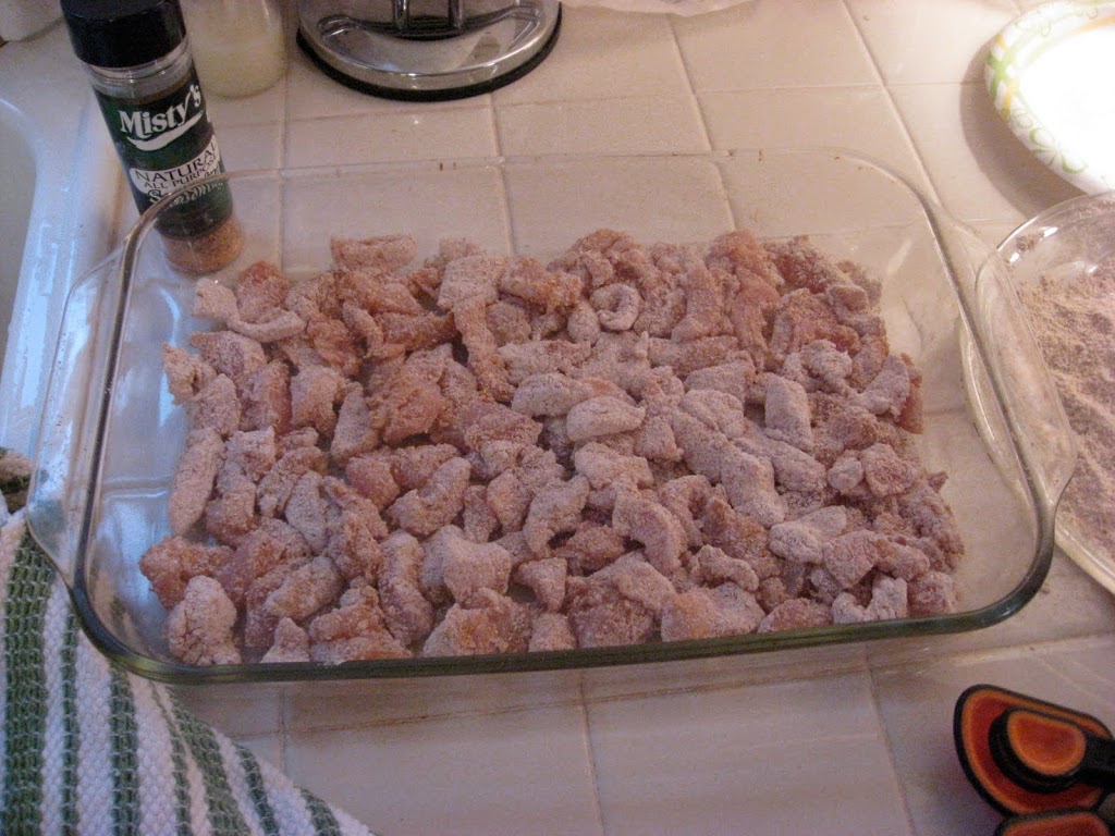 In a shallow dish (like a glass pie plate), mix flour and seasonings. Cut Chicken into bite-sized pieces (use kitchen shears) Toss chicken into seasoned flour mixture to coat well.