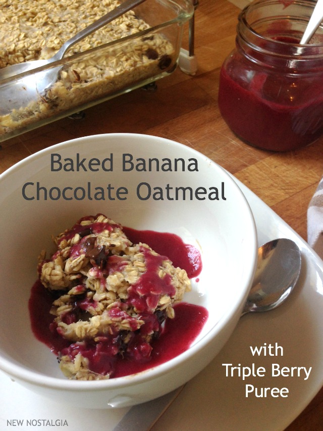 Baked Banana Chocolate Oatmeal with Triple Berry Puree