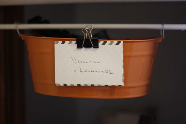 I can now get to my vacuum quickly, and the attachments are all in one place stored above the vacuum.  I hung them in a bucket on a tension rod that I found in the back of the closet.  I also found a hook that is perfect for hanging my camera bag.  I take photos constantly for New Nostalgia and now my Colsie has an interest in photography, so I like having a specific place for the camera where everyone knows where it is and where to put it away.