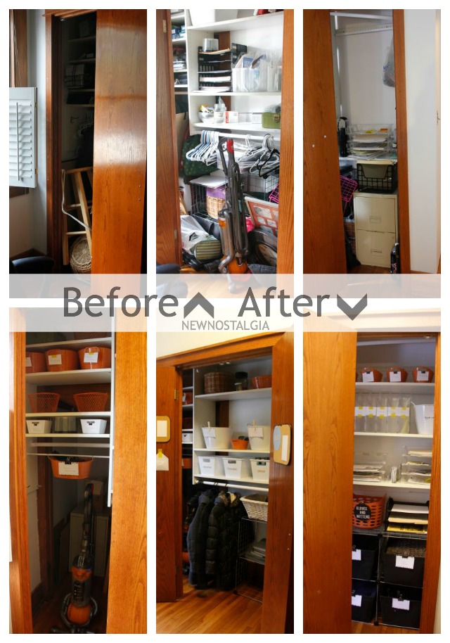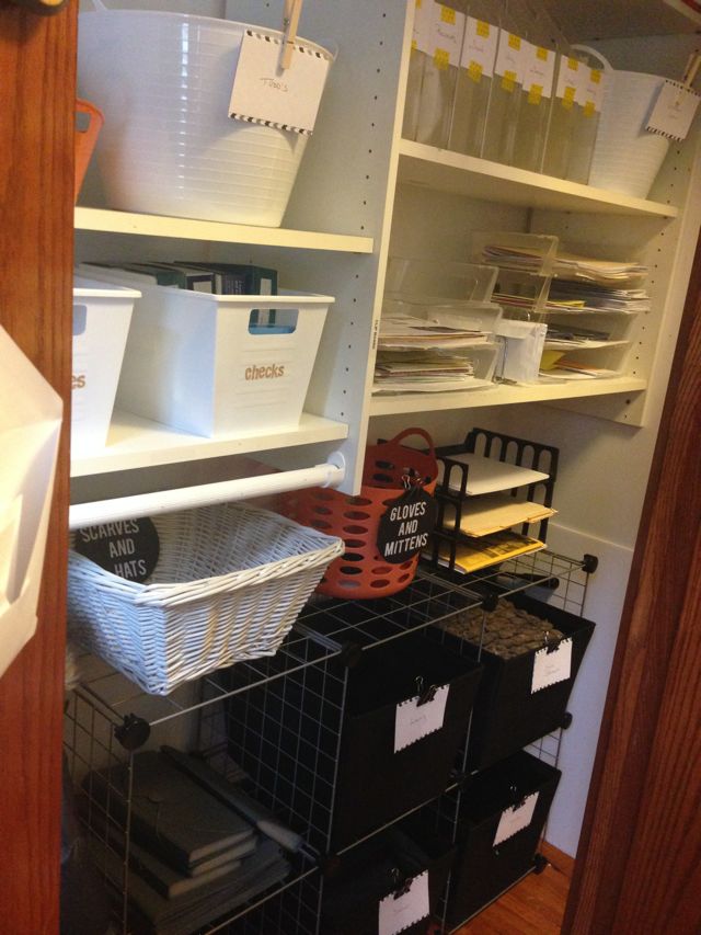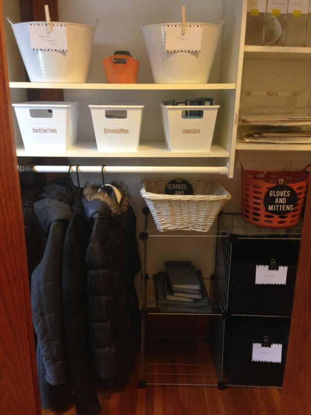I’m super excited about how the closet turned out.  I can’t believe the difference.  Because the closet is in such a central location in our home, and because we do not have a coat closet, I decided to make this closet an office/coat closet.  This is why you see coats hanging & bins marked for mittens, gloves, scarves & hats.  I even kept an open square of the wire shelving open for storing my snow boots.