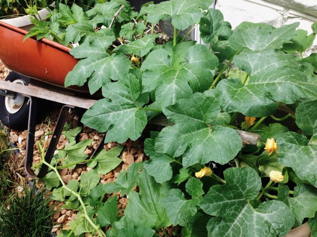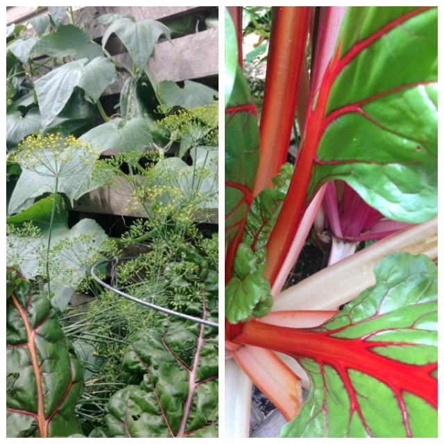 Whoa, right?  Amazing.  Those tiny swiss chard plants have been growing leaves bigger than my head.  They are great for juicing, blending into green smoothies.  Basil is sitting pretty right next to it, and will be made into pesto this week.  There is dill in there, taller than my waist.  My cucumbers are super happy and just keep growing up, up, up and producing much fruit.  I used a pallet as support for my cuckes and it has worked great. There is a pepper plant in there…which is hard to see.  I replaced kale with baby pumpkin after the cool weather growing season of spring.